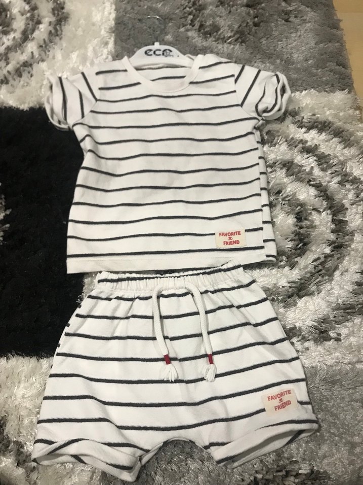 Kısa kollu, yuvarlak yaka çizgili üst ve pamuklu şortlardan oluşan beyaz ve gri bebek erkek takımı. Rahat ve şık bir görünüm sunar.