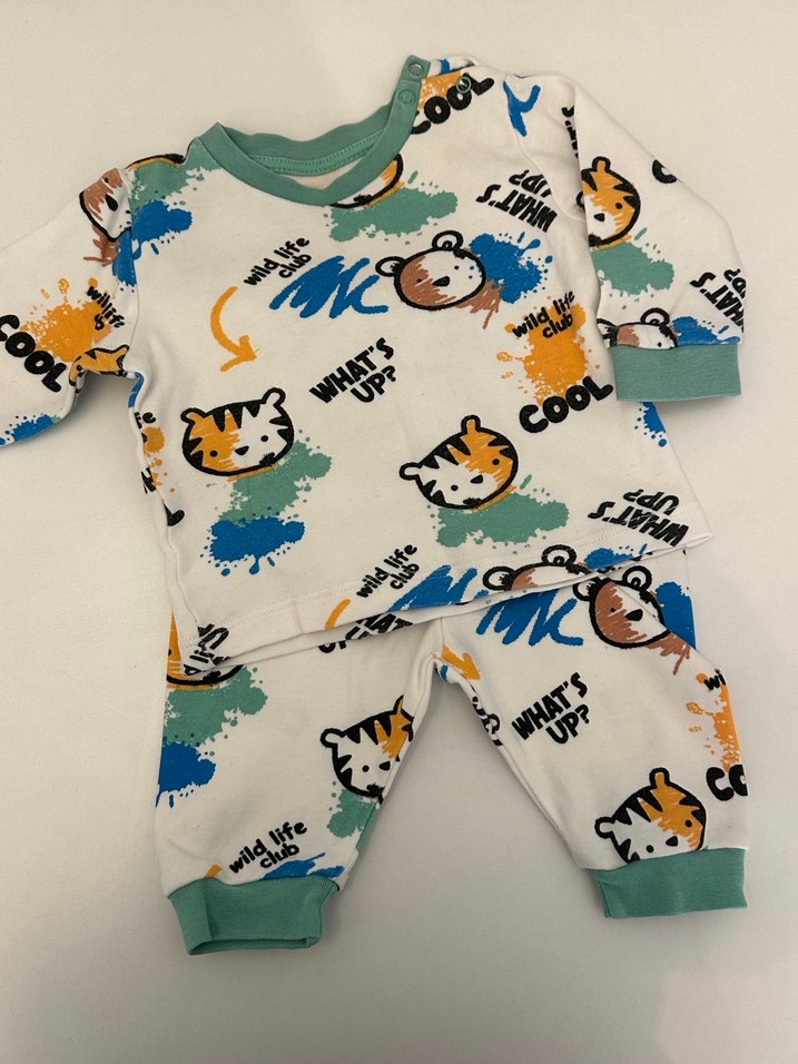 Pamuklu, uzun kollu, çok renkli baskılı bebek erkek takımı. Rahat sokak stili, omuzda kolay giydirme için çıtçıtlı, hayvan desenli. 3-6 aylık ölçü. Az giyildi hiçbir sorunu yoktur.