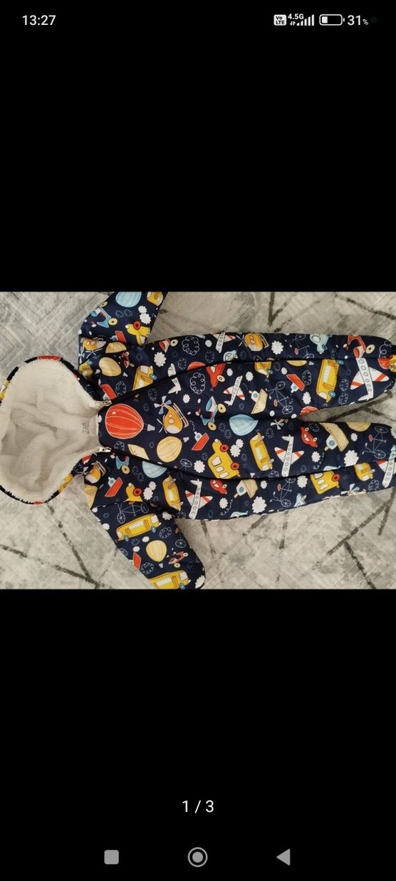 Yumuşak ve sıcak kumaştan yapılmış, çok renkli desenli ve kapüşonunda kürk detaylı bebek erkek tulumu. Sokak modası tarzında, koyu çok renkli. 3-6 ay uyumludur.