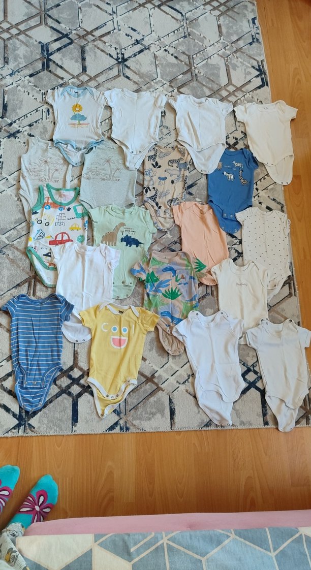 Bebek erkek için kısa kollu, çeşitli açık renklerde ve sade desenlerde, yumuşak dokulu tekstil kumaşından yapılmış çoklu body seti. 19 parça 3- 6 ay