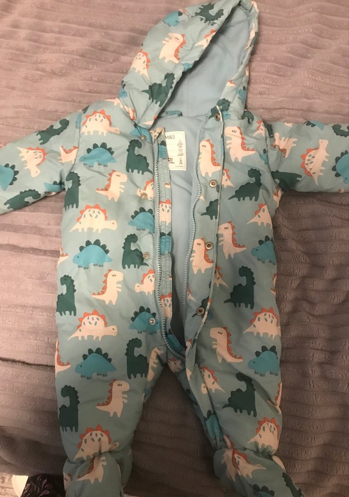 Bebek erkek tulumu, pastel gri dinozor desenli, fermuarlı ve yumuşak, sıcak tutan kumaştan üretilmiştir. Sokak tarzı için uygundur.
