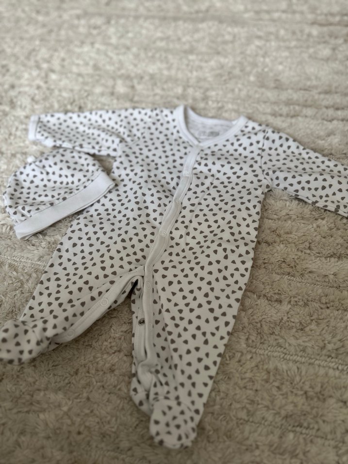 Uzun kollu kendinden eldivenli ve pamuklu bebek erkek hastane tulumu ve şapka seti, yumuşak ve sıcak kumaştan üretilmiştir.