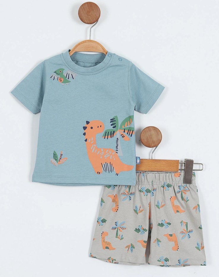 Mavi kısa kollu pamuklu tişört, gri dinozor desenli şort ile tamamlanmış bebek erkek takım. 0-9Ay/ 1,5 yaş/2 yaş bedenleriyle mevcuttur
