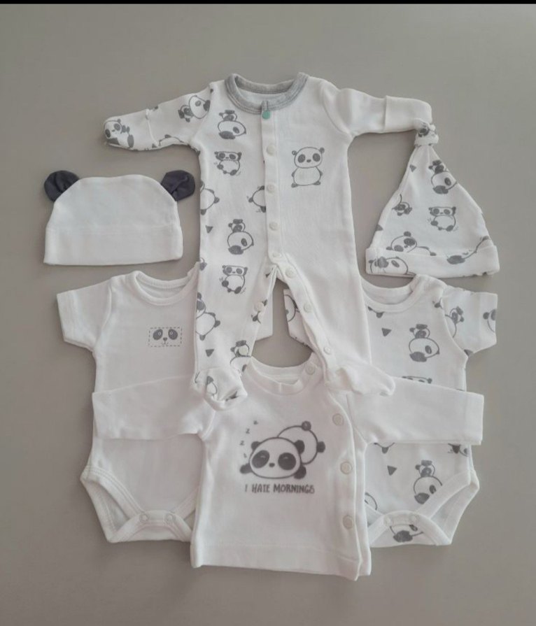 Beyaz ve gri tonlarda panda desenli, uzun kollu ve yumuşak sıcak kumaştan oluşan 5 parçalı bebek erkek hastane çıkışı seti. Sayılı kullanıldı.