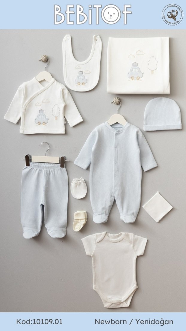 Pamuklu, pastel tonlarda bebek erkek hastane seti; kısa kol body, uzun kol üst, pantolon ve aksesuarlar içerir. Minimal ve rahat tasarıma sahiptir.