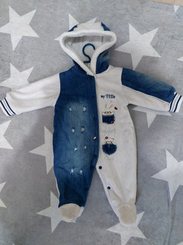 Bebek erkek tulumu, örme detaylı ve renkli baskılı desenlidir. Kapüşonlu ve yumuşak tüylü kumaştan yapılmıştır, rahat sokak stili sunar. ❄️
