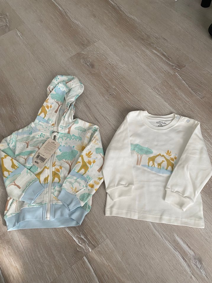 Bebek erkek için uzun kollu, bisiklet yaka üst ve fermuarlı kapüşonlu, pastel hayvan desenli takım. Yumuşak ve sıcak kumaştan üretilmiştir.