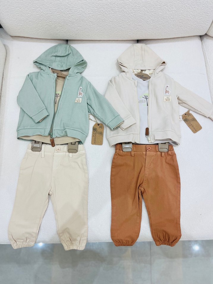 Pastel renklerde, kapüşonlu uzun kollu üst ve kemerli pamuklu pantolondan oluşan bebek erkek takımı. Baskılı detayları ve rahat stili bulunur. 100 pamuk beden sorunuz