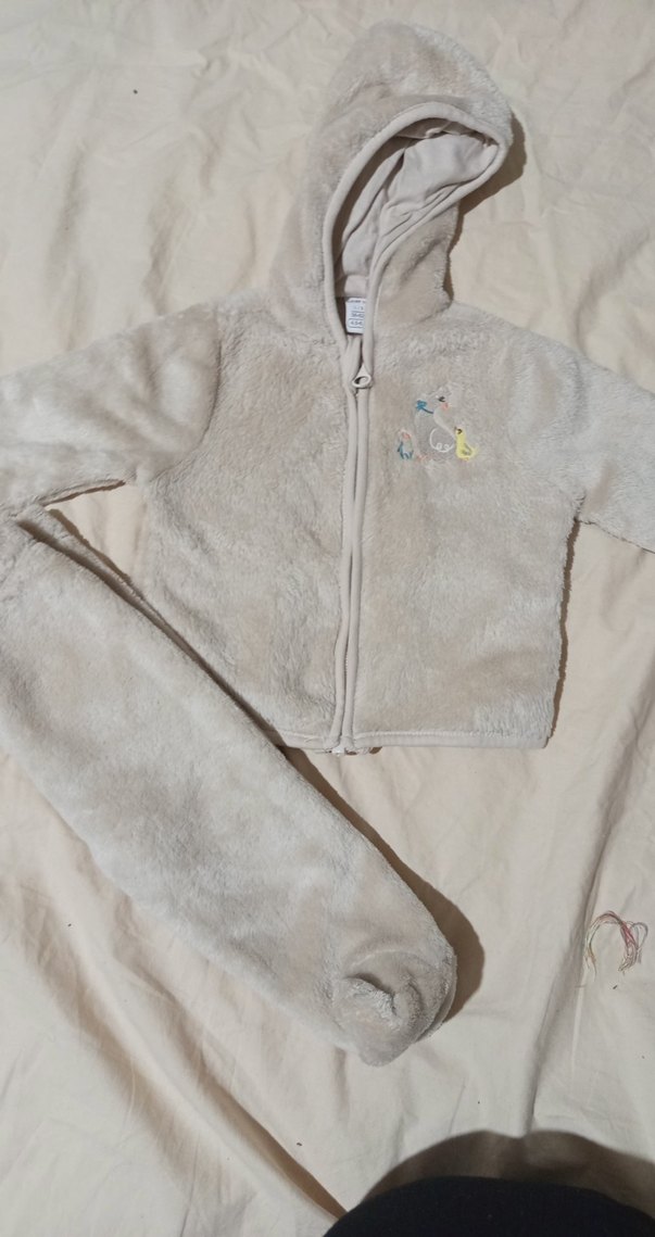 Bej renkli, kapüşonlu, nakış detaylı ve yumuşak tüylü bebek erkek tulumu. Sokak stili için uygun rahatlıkta.