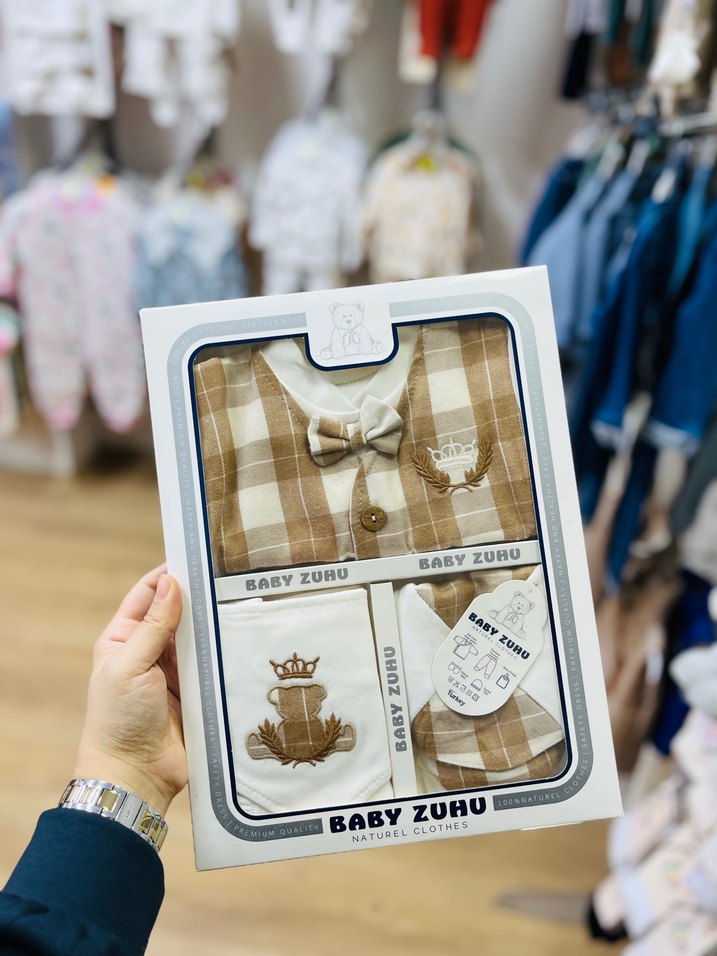 Pamuklu, uzun kollu ve bisiklet yaka bebek erkek takım. Açık kahverengi kareli ve baskılı detaylara sahip. Rahat sokak stili sunar. Yenidoğan 5 li set