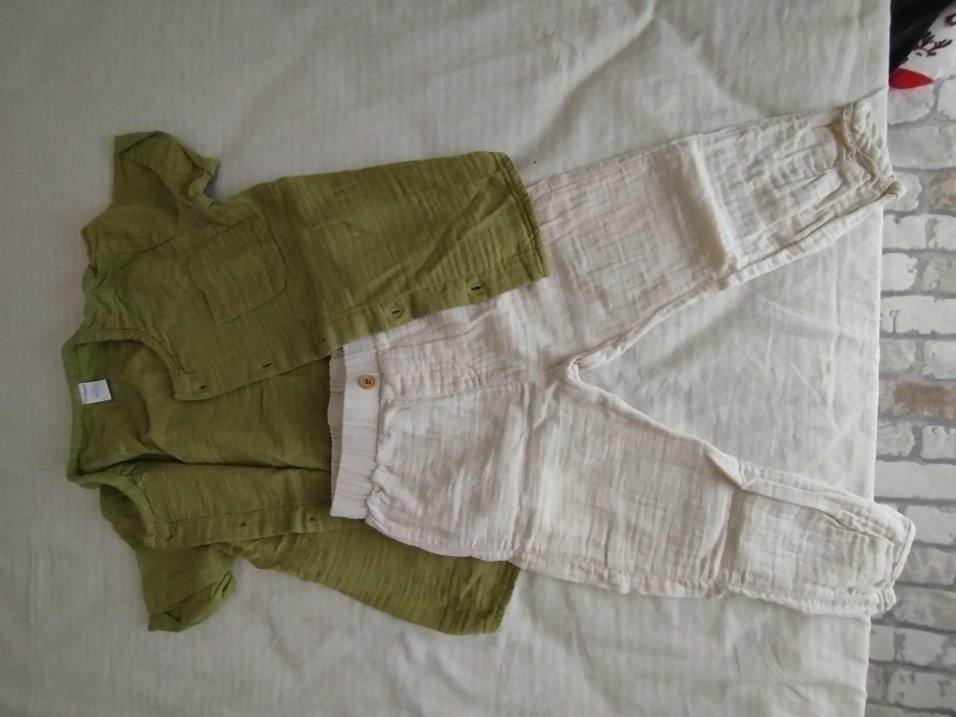 Bebek erkek keten kumaştan, düğmeli, bohem tarzda, yakası kesik uzun kollu üst ve açık renk pantolon takımı. Kumaş yumuşak ve nefes alır.