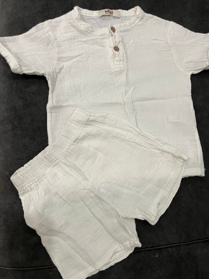 Beyaz keten kısa kollu, düğmeli ve bisiklet yaka üst ile uyumlu şortlardan oluşan bohem tarzda bebek erkek takımı.