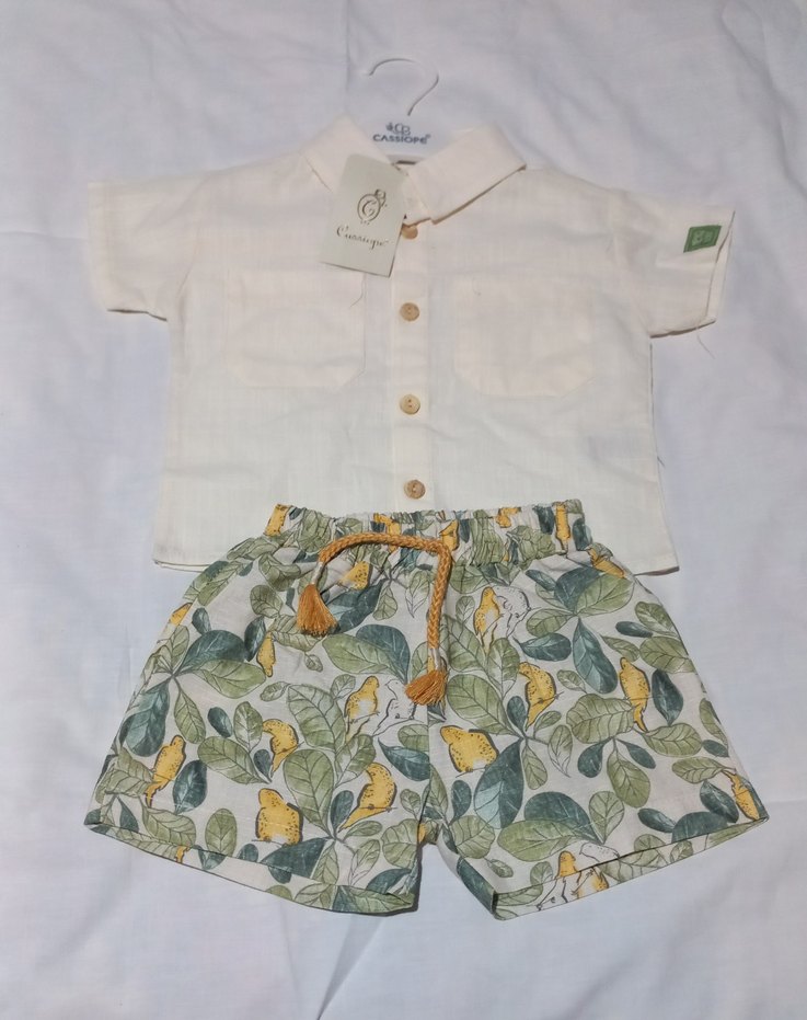 Bebek erkek için kısa kollu, düğmeli bej keten gömlek ve yaprak desenli, bağcıklı keten şort takım. YENİ VE ETİKETLİDİR,HEDİYELİK OLABİLİR. 9ay-18ay-2yaş-3yas-4yaş-5yaş olanlari var