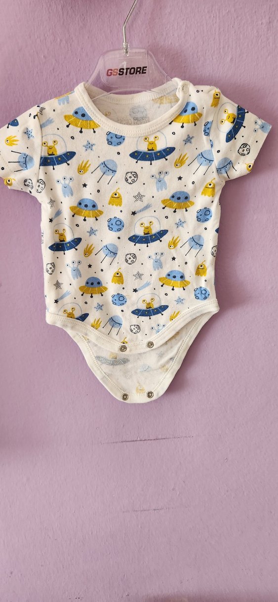 Beyaz renkte, kısa kollu ve yuvarlak yaka bebek erkek body. Renkli uzay temalı baskıları ve kolay giydirme için düğmeleri vardır.