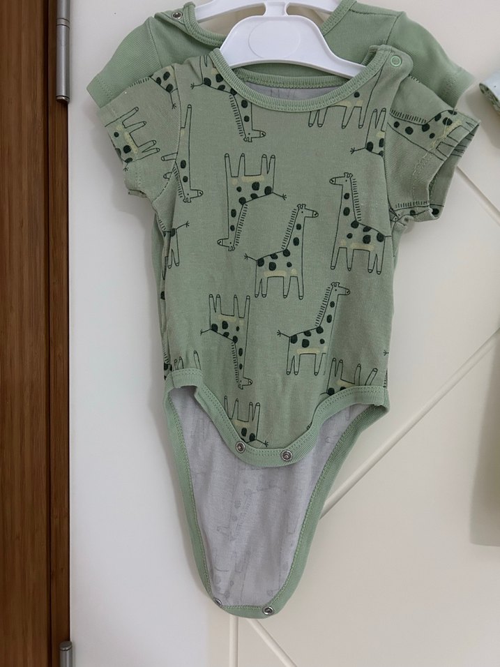 Bebek erkek kısa kollu, yuvarlak yakalı, zürafa baskılı yeşil body. Altında çıtçıtlı, kolay giydirme sağlar.