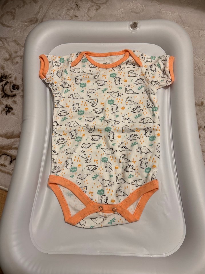 Hiç giyilmedi Bebek erkek için kısa kollu, yuvarlak yaka ve pastel dinozor baskılı, turuncu kenarlıklı body. Kolay giydirme için çıtçıtlıdır.