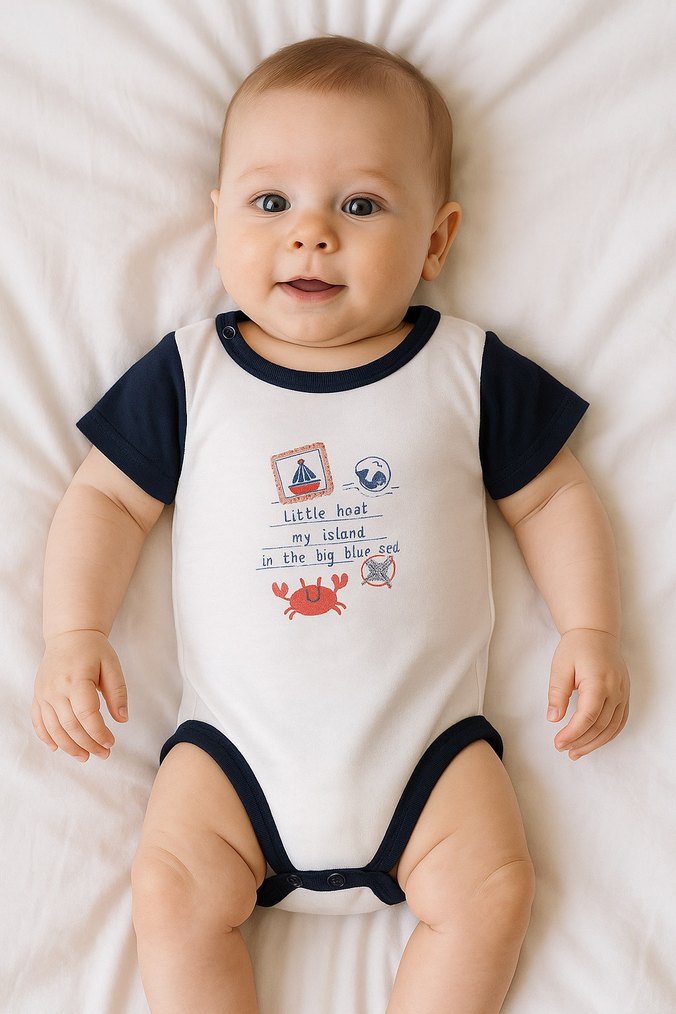 Pamuk kumaştan, kısa kollu ve bisiklet yaka bebek erkek body. Deniz temalı baskılı deseni ve açık renkleriyle sade bir tarz sunar.