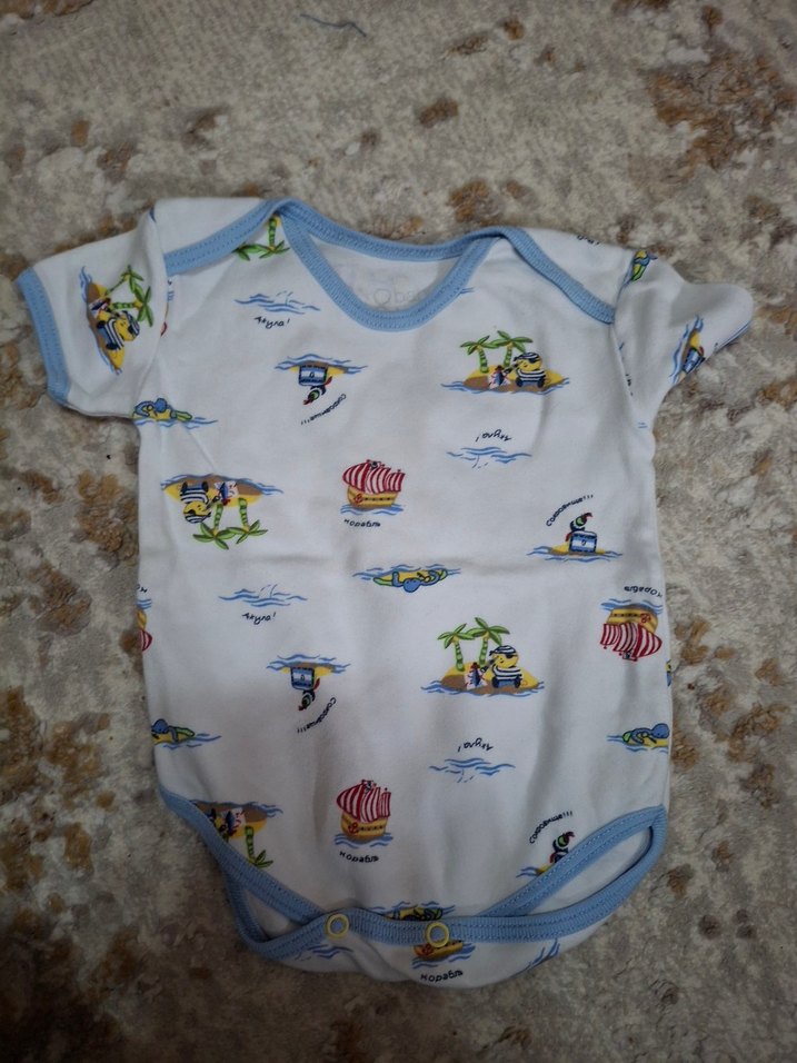 Bebek erkek kısa kollu, yuvarlak yakalı, yumuşak ve sıcak örme kumaştan yapılmış body. Beyaz zemin üzerine pastel renkli baskılar ve mavi detaylar bulunur.