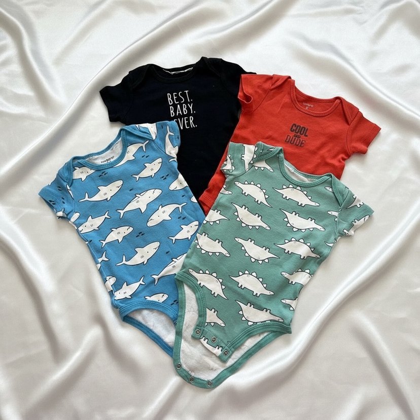 Pamuk kısa kollu, baskılı ve yuvarlak yakalı dört adet bebek body seti. Canlı ve koyu renklerde, eğlenceli desenler ve yazılar içerir. Mavi ve yeşilde çok az leke var. Turuncunun çıtçıtları kapanıyor fakat minik delikler var. Sadece bebek sabunuyla yıkıyorum. (Siveno) belki leke çıkarıcıyla çıkar. Carters’ın kalitesini bilen bilir. Onun dışında bir sorun yoktur.
