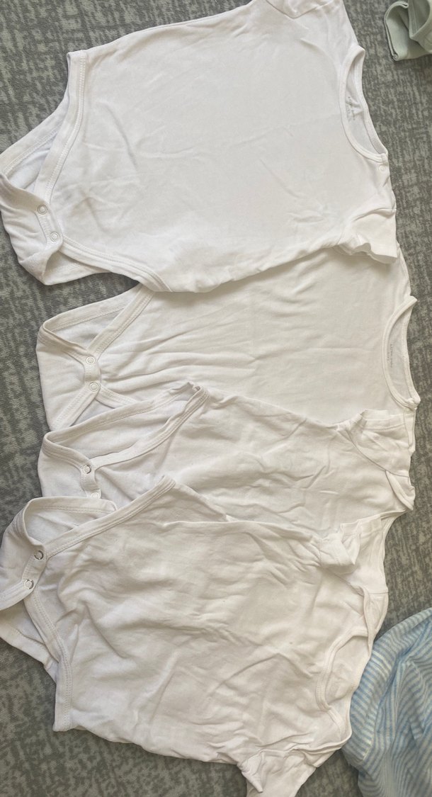 Yumuşak keten kumaştan, kısa kollu, beyaz renkli bebek erkek body. Rahatlık için yuvarlak yakalı, sade tasarım içerir. Ürünün bir tanesi hiç kullanılmadı diğer zınında ufak nokta kadar bi leke var toplam 4 adet fiyatıdır başka kusurları yoktur
