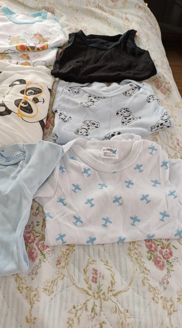 Yumuşak pamuktan yapılmış, kısa kollu, yuvarlak yakalı ve düğmeli beyaz bebek erkek body. Sade ve streetwear tarzında, desen yok. 9 adet karisik yenidogan zibin az kullanilmis