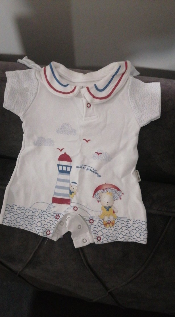 Kısa kollu, düğmeli yakalı bebek tulumu, yumuşak pamuklu kumaştan, deniz feneri ve çocuk desenli. Hafif renkte, günlük kullanım için uygundur.