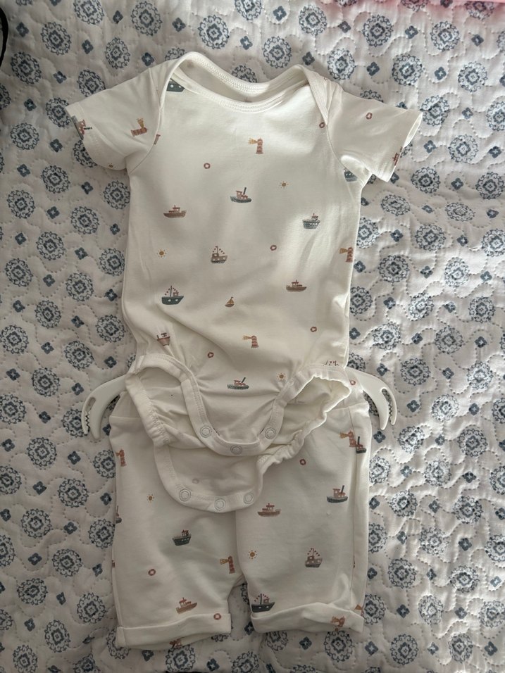 Yumuşak tekstilden yapılmış, kısa kollu bebek erkek body ve şort takımı, pastel renkli küçük tekne desenleriyle ve rahat askısız yakayla. ⚓ hiç giyilmedi. 2-4 aylık