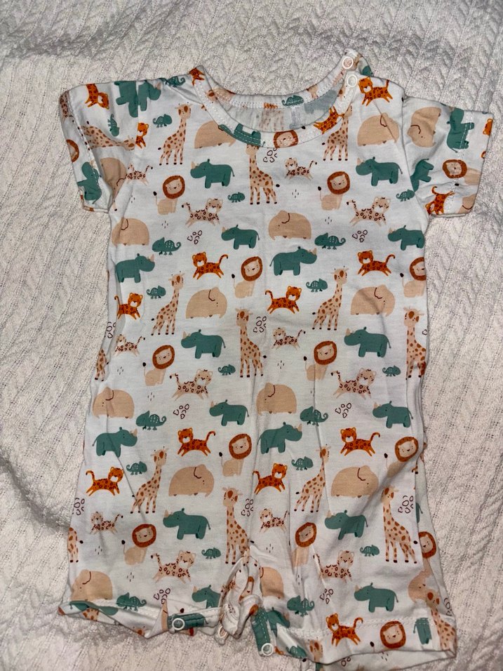 Kısa kollu, bisiklet yaka, canlı hayvan desenli, yumuşak örme sentetik kumaştan bebek tulumu. Rahat ve sokak tarzı için uygundur. Hiç giyilmedi sapasağlam