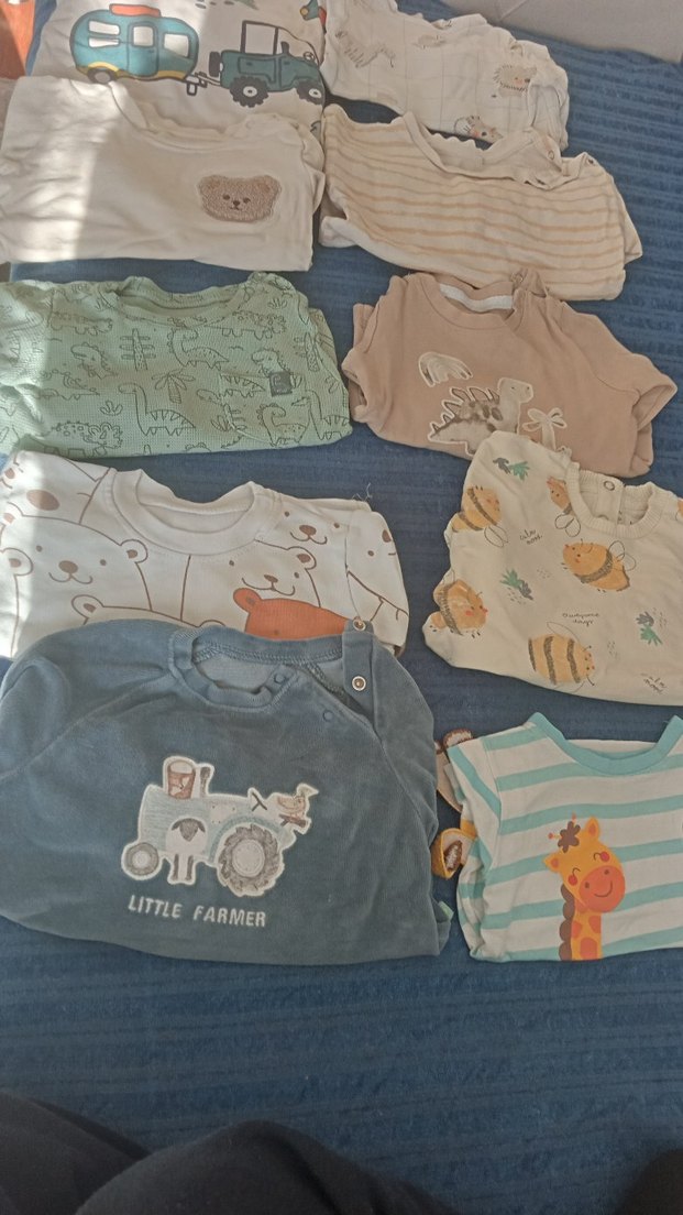 Açık renkli, kısa kollu, örme kumaştan bebek erkek tişörtleri, baskılı desenlerle ve bisiklet yakalı. Birinde "LITTLE FARMER" yazısı ve traktör görseli var.hepsinin fiyatıdır