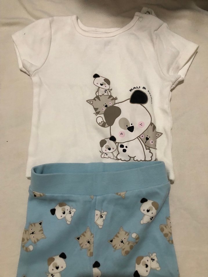 Beyaz kısa kollu pamuklu üstü sevimli köpek baskılı, pastel mavi baskılı pantolonlu bebek erkek takımı.