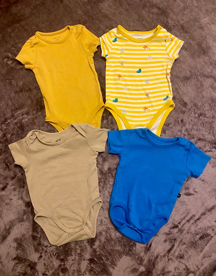 Dört adet kısa kollu, yuvarlak yakalı ve pastel renklerde (sarı, bej, mavi) pamuklu bebek erkek body seti. Bir body çizgili ve küçük renkli baskılar içerir. Toplu fiyattır tek adet alımda 50₺’dir. 3-6 ay Lcw baby ve HM ürünleri.