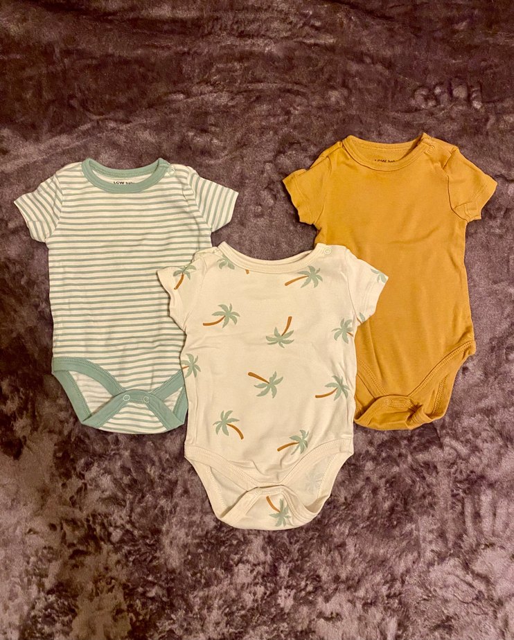 Pastel renklerde, kısa kollu pamuklu üç bebek erkek body seti. Çizgili ve palmiye desenli modellerle rahat sokak stili için uygun. 1-3 ay - 3 adet toplu fiyattır.