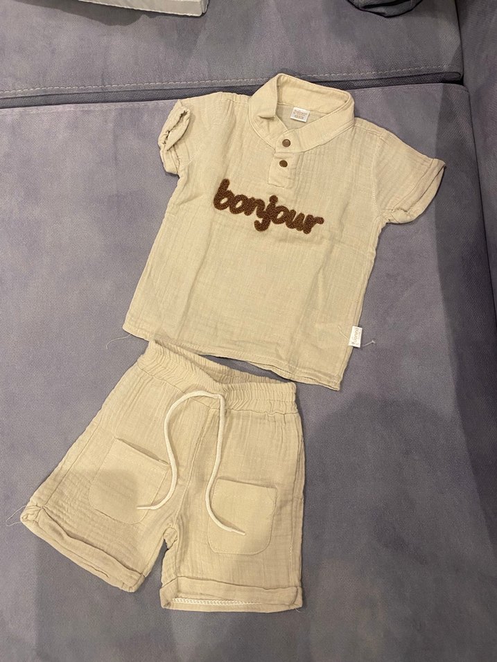 Bebek erkek için pastel kahverengi kısa kollu, düğmeli bisiklet yaka ve 'bonjour' baskılı üst ile cepli şort takımı. Yumuşak pamuklu kumaştan yapılmıştır.