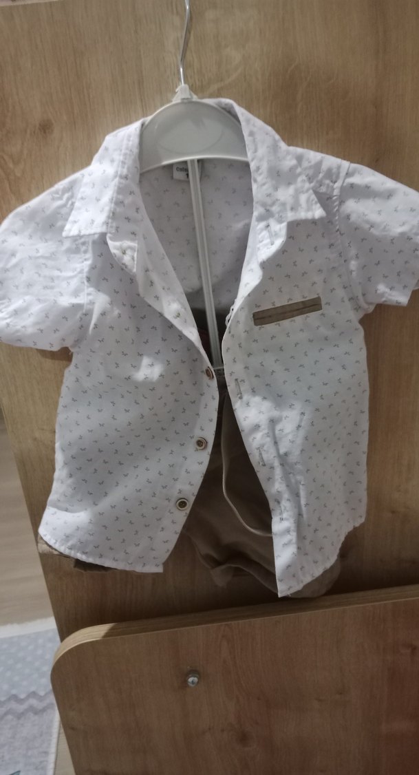 Kısa kollu, düğmeli ve yakalı beyaz pamuklu gömlek ile gri desenli alt parçadan oluşan bebek erkek takımı. Streetwear tarzında rahat ve şık.