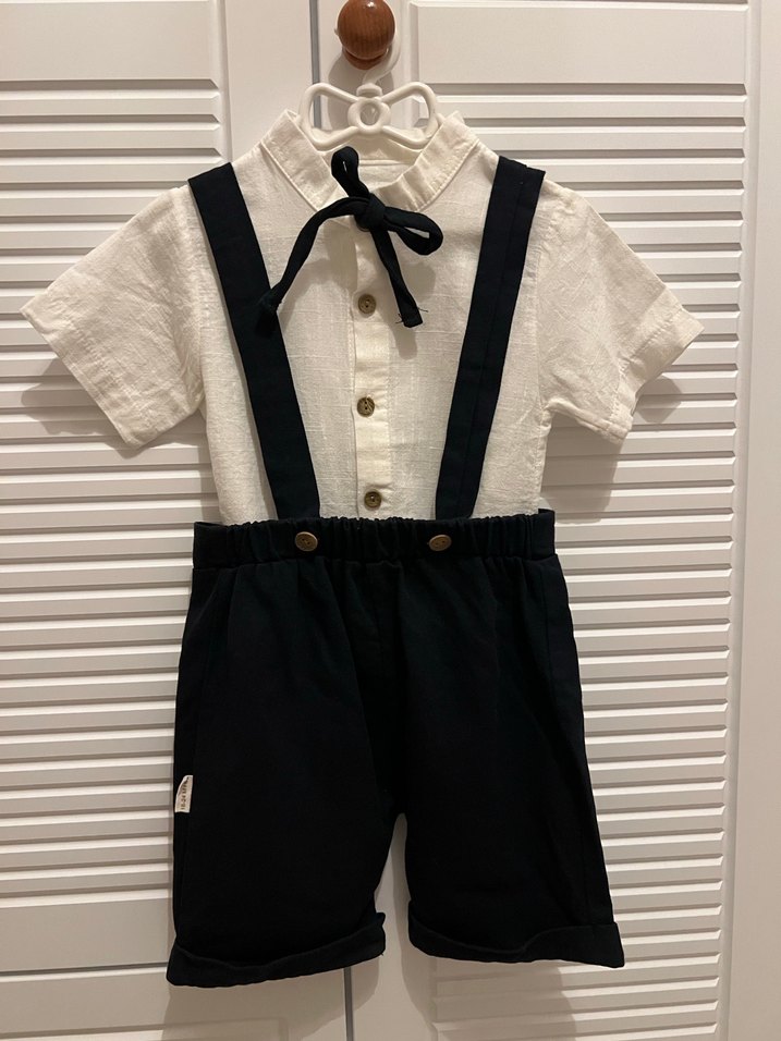 Beyaz kısa kollu, düğmeli yakalı pamuklu gömlek ve koyu renk askılı şortlardan oluşan bebek erkek tulumu. Rahat sokak stili için uygundur.