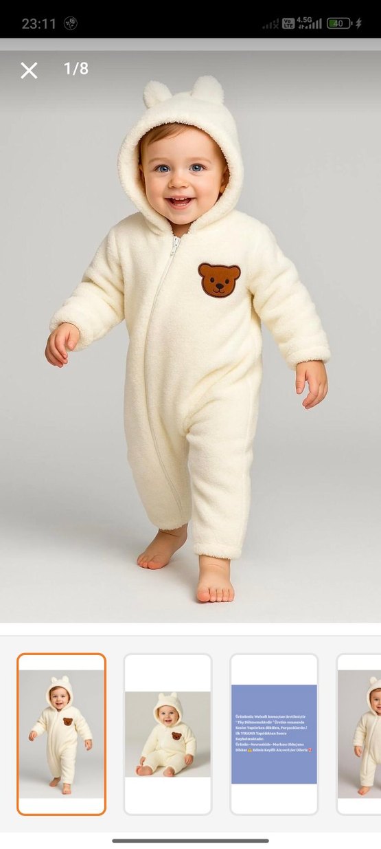 Bu beyaz bebek erkek tulumu, yumuşak ve sıcak kumaş, kürk detayları ve göğsünde ayı figürü ile tasarlanmıştır. Kapüşonlu ve önden fermuarlıdır. seçenekler de olmadığı için 3-6 aylık