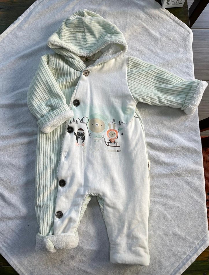 Pastel beyaz renkte, düğmeli ve baskılı desenli, kapüşonlu ve fitilli kollu bebek erkek kızauyumlu, tulum yumuşak ve sıcak kumaştan üretilmiştir. ❄️