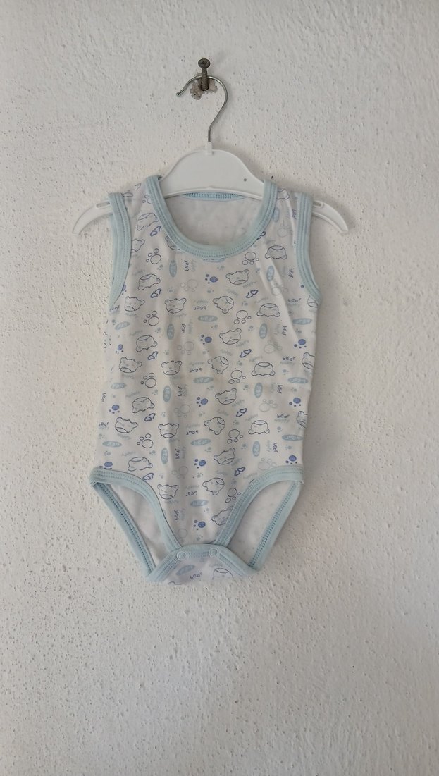Kolsuz, yuvarlak yakalı bebek erkek body, yumuşak ve sıcak kumaştan, pastel mavi detaylar ve ince dantel süslemeli.