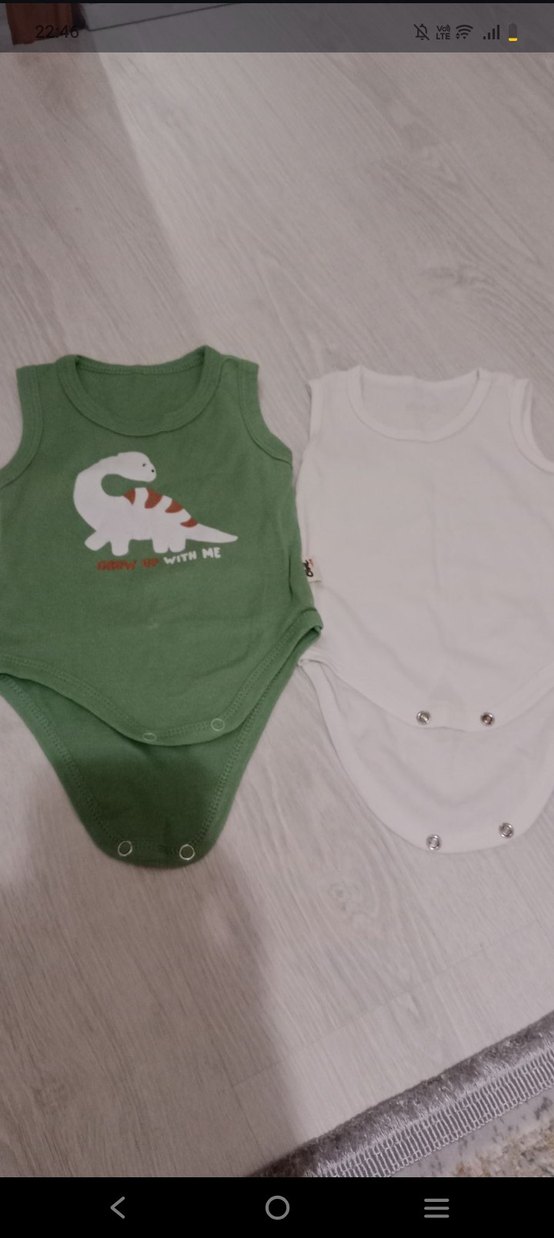 Bebek erkekler için kolsuz, pamuklu body seti. Yeşil dinozor baskılı ve düz beyaz, yuvarlak yaka ve çıtçıtlı kapanışlı.