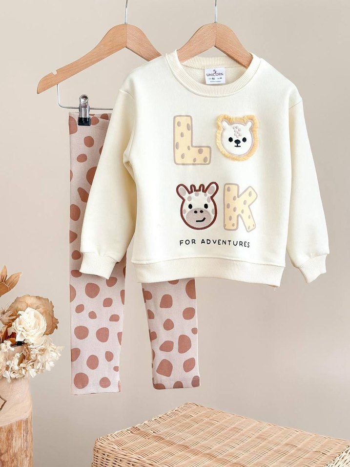 7-8 yaş için açılmış ilandir Bebek erkek için leopar desenli, kürklü detaylı uzun kollu üst ve pastel renkli pantolon takımı. Yumuşak ve sıcak kumaştan, 'FOR ADVENTURES' yazılı.