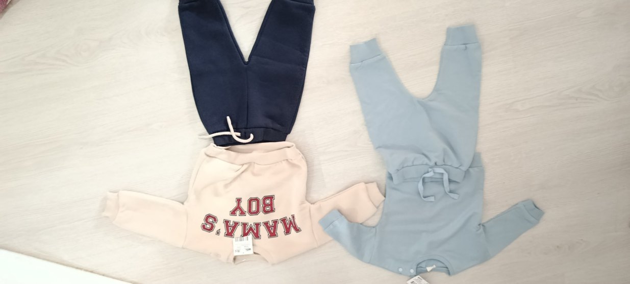 Bebek erkek mavi takımı, uzun kollu ve yuvarlak yakalıdır. Pastel tonlarda baskılı ve yumuşak, sıcak kumaştan yapılmıştır.