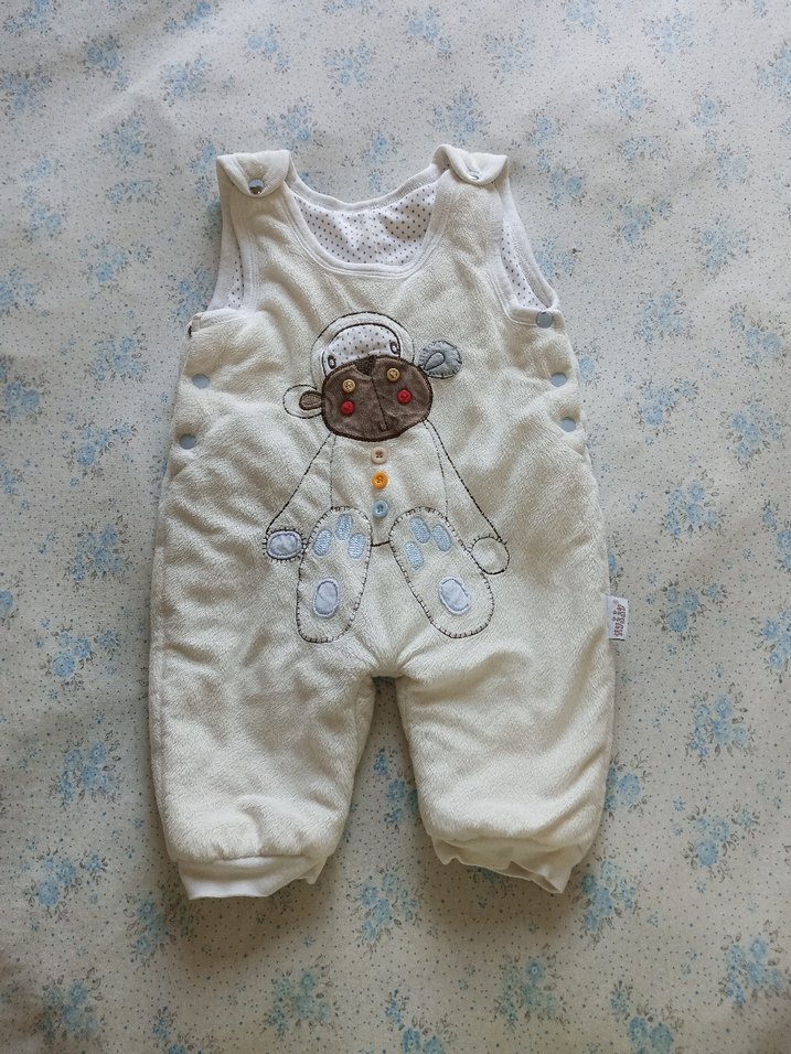 3-6 Ay Renkli nakışlı detaylara ve örme dokusuna sahip beyaz polar bebek erkek tulumu, streetwear tarzında.