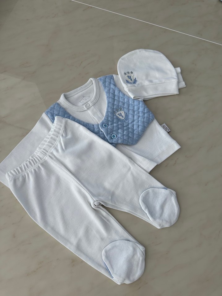 Nakışlı triko yelek, uzun kollu bisiklet yaka üst, ayaklı pantolon ve şapka içeren pamuklu bebek erkek takımı.