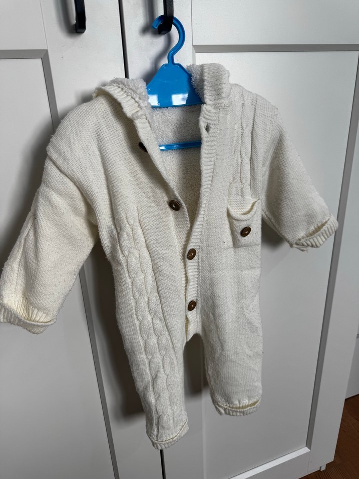 Kapüşonlu, düğmeli beyaz örgü bebek erkek kar tulumu. Yumuşak örgü kumaş sayesinde sıcak ve rahat. Küçük cep detayı bulunur. ❄️