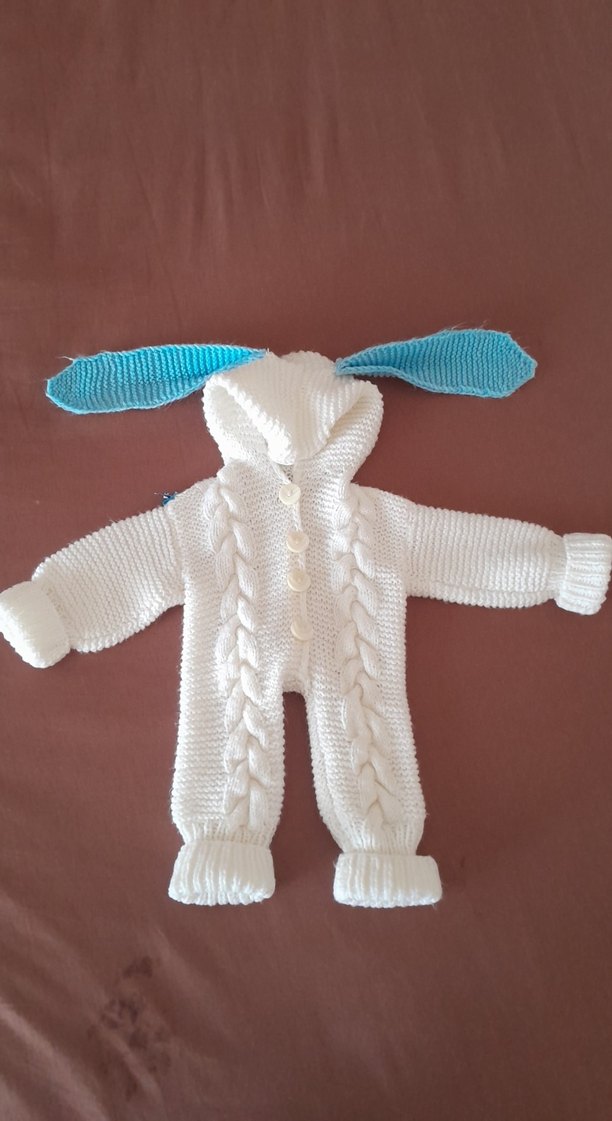 Beyaz renkli, örgü kumaştan yapılmış bebek erkek tulumu, kapüşonunda renkli mavi kulaklar ve düğmeli kapanışı ile bohem tarzındadır. ❄️