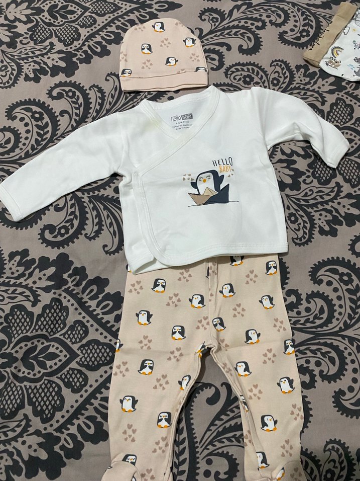 Beyaz uzun kollu, boğazlı üst, gri örme penguen desenli pantolon ve şapka içeren yumuşak ve sıcak bebek erkek 3'lü takımı.