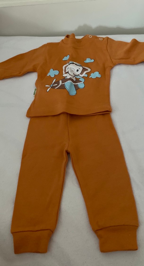Bebek erkek için kahverengi örme uzun kollu üst ve pantolon takımı. Üstte renkli fil baskısı, yuvarlak yaka ve omuz düğmeleri bulunur.