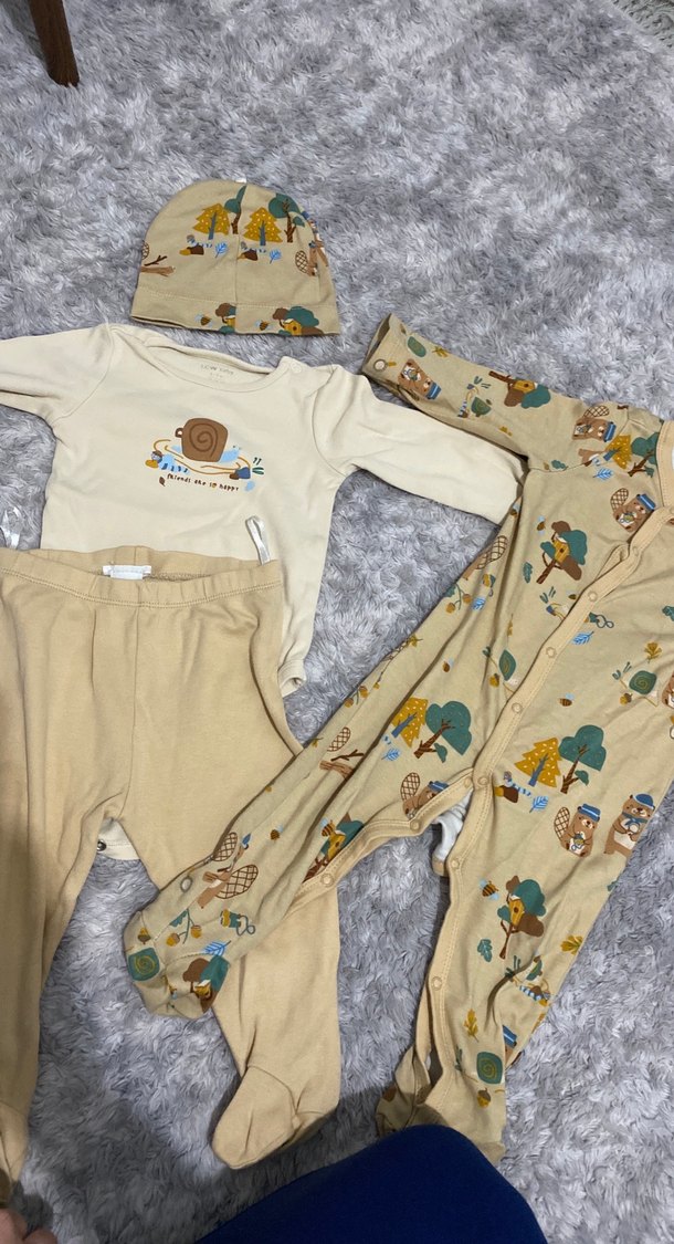Bebek erkek için örme şapka, uzun kollu boğazlı body, pantolon ve baskılı tulumdan oluşan yumuşak ve rahat 4'lü set. Pastel kahverengi tonlarda, sıcak tutar.