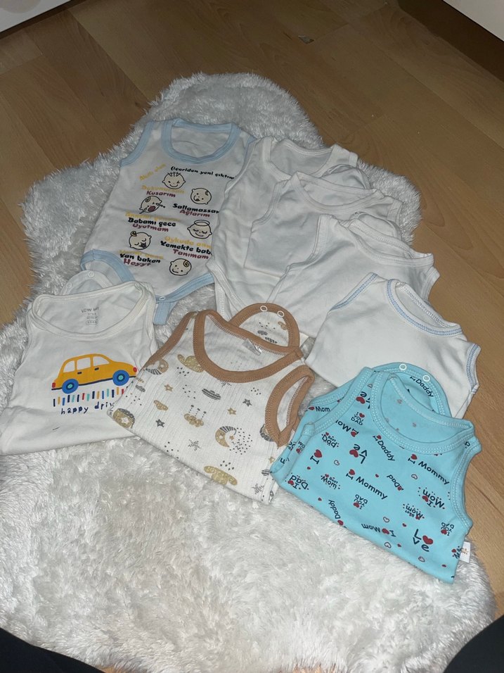 Yumuşak pamuktan, kolsuz ve örme bebek erkek hastane kıyafetleri seti. Beyaz ve pastel renklerde, çeşitli baskılı desenlerle sade ve rahat stil sunar.