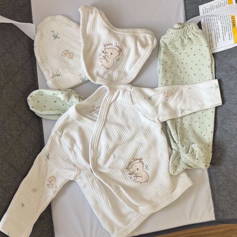 Nakışlı hayvan desenleriyle örme uzun kollu pamuklu üst, pastel renk pantolon ve uyumlu aksesuarlar içeren bebek erkek takımı.